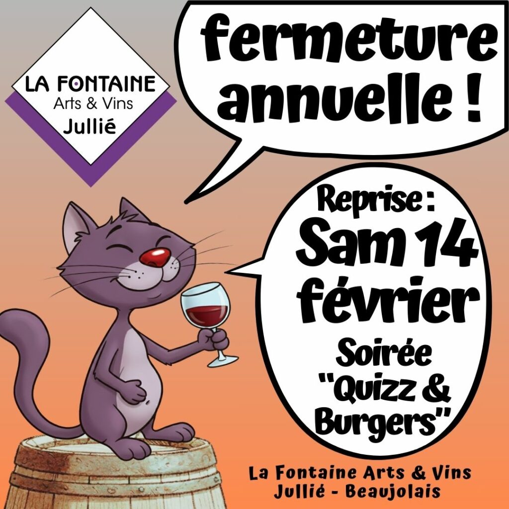 Les Amis des Vins de Jullié et la Fontaine Arts et Vins s’associent pour vous proposer une soirée « Beaujolais Nouveau », festive, gourmande, conviviale et dansante. Rendez-vous le jeudi 20 novembre à partir de 19h, au caveau de la Fontaine Arts et Vins.