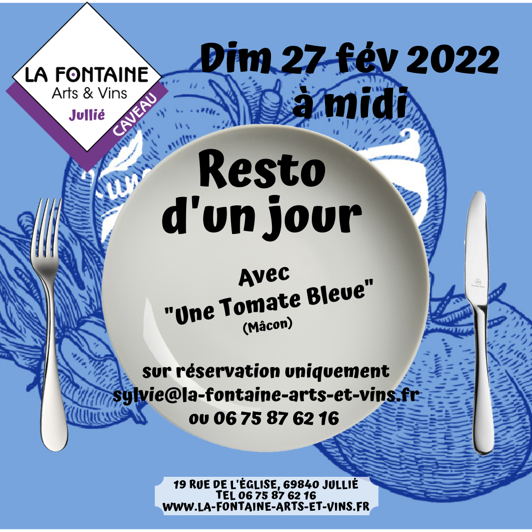 Pour cette troisième session, nous avons le plaisir de collaborer avec le restaurant « Une Tomate Bleue » (Mâcon). Le principe est toujours le même : nous transformons le temps d’un dimanche midi, notre bar à vins en restaurant, en invitant un restaurateur à cuisiner pour vous. Nous nous chargeons du service… et de la carte des vins ! Rendez-vous donc le dimanche 27 février prochain.