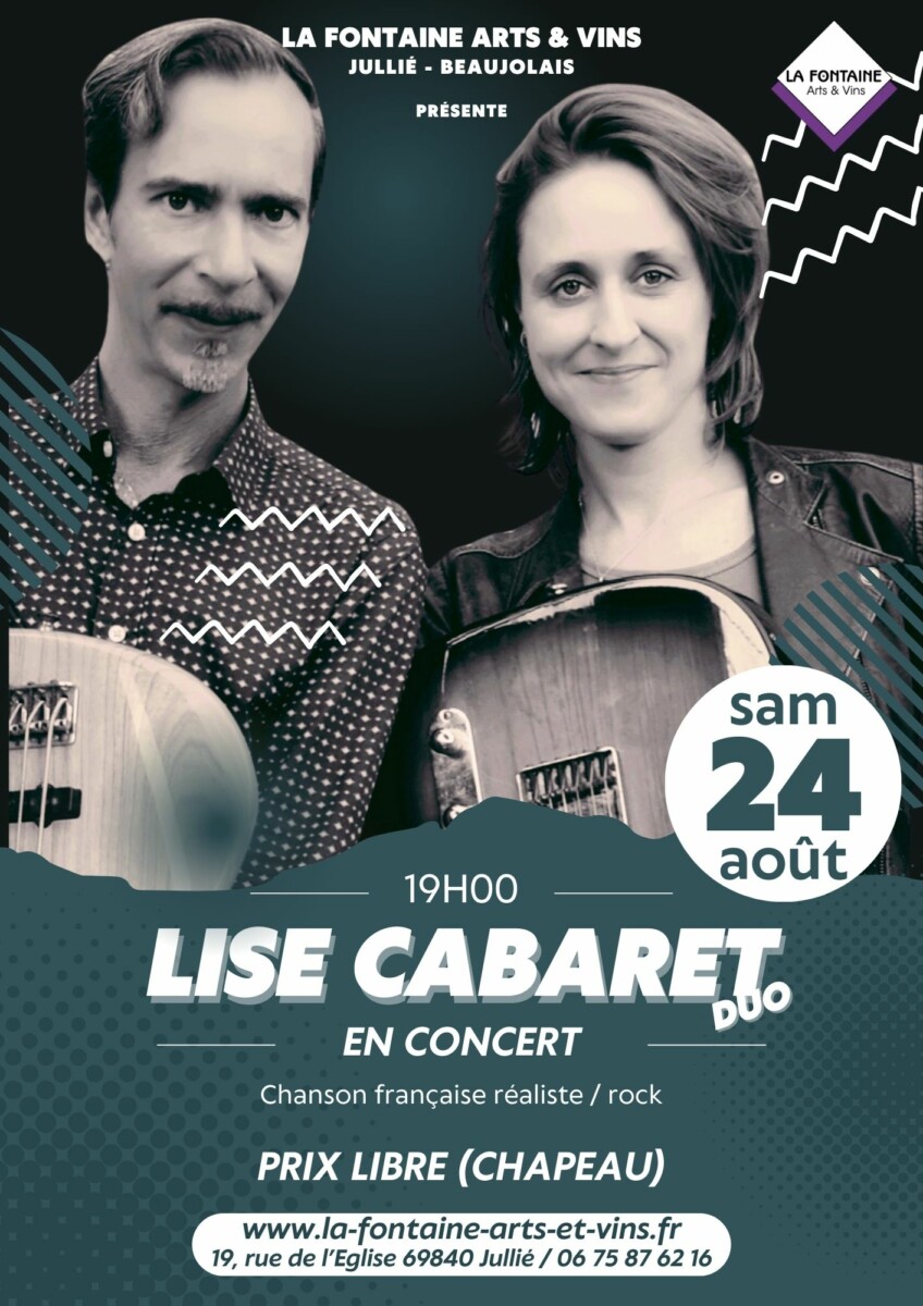 Ce n’est pas la première fois que nous accueillons Lise Cabaret au caveau, mais cette fois-ci, elle sera accompagné de Nicolas (multiinstrumentiste qui jouera de la basse pour l’occasion…), bien connu des musiciens locaux (il a développé sa propre école de musique sur Jullié et dirige chorale et autres ensembles…). Lise nous proposera ses propres compositions agrémentées de quelques reprises, réarrangées pour l’occasion !