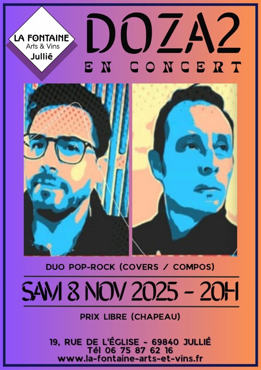 Samedi 8 novembre à 20h, nous accueillons au caveau le duo DOZA2, en concert et à prix libre (chapeau), comme d’habitude.