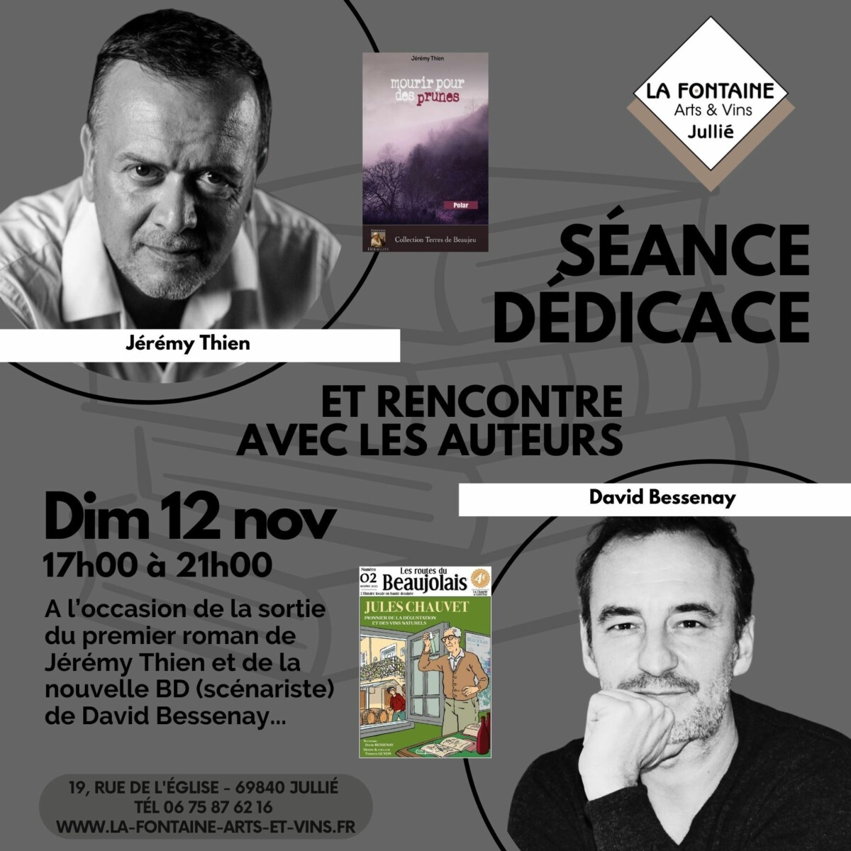 A l’occasion de la sortie du premier roman de Jérémy Thien « Mourir pour des prunes » aux éditions Héraclite et de celle du deuxième volet de la BD de David Bessenay, en tant que scénariste, consacrée à Jules Chauvet et publiée aux Editions du 3ème jeudi, nous avons le plaisir d’accueillir les deux auteurs pour une séance dédicace. Vous pourrez évidemment échanger avec eux pour parler littérature… et vins ! Rendez-vous le dimanche 12 novembre de 17h00 à 21h00