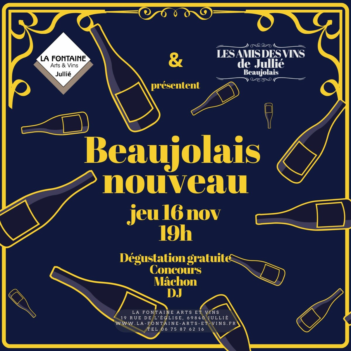 Les Amis des Vins de Jullié et la Fontaine Arts et Vins s’associent pour vous proposer une soirée « Beaujolais Nouveau », festive, gourmande, conviviale et dansante. Rendez-vous le jeudi 16 novembre à partir de 19h, au caveau de la Fontaine Arts et Vins.